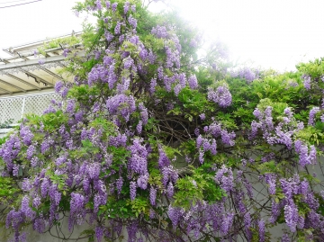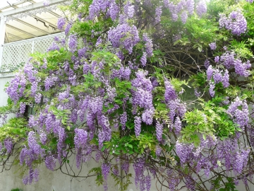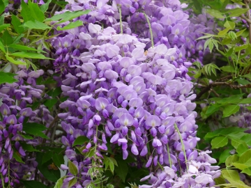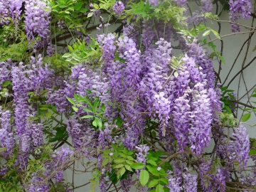 紫藤為蝶形花科紫藤屬落葉木質藤本,原產大陸華北、韓國、日本等地,奇數羽狀複葉,嫩葉具細毛,蔓莖盤曲、春末3~4月開花,花軸長度近30公分,每軸著花20~80朵,花多而香,單串開花可達15日經久不凋,花可食用,涼拌、裹麵油炸、製作糕餅皆宜,盛暑密葉遮蔭,莢果纍纍,10月果熟,內含扁圓種子2~3粒,種子有毒,植株耐寒,高冷地栽植花串更長,花色亦較平地更為深艷,植株壽命可達數百年。 |