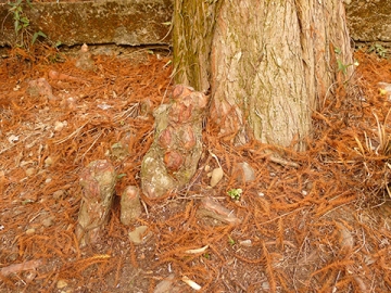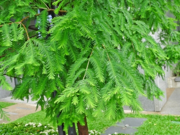 落羽松為杉科落羽松屬落葉喬木,原生北美沼澤,可長年生長在淺水中,高可達25公尺,生長快速喜熱耐寒,塔錐形的樹相整齊雅緻,台灣平地種植即有四季分明的樹相,春翠綠、夏青蔥,秋金黃(平地),冬落葉,山區冷涼之地秋季葉色火紅,愈冷愈美,木材耐腐蝕,為造船、建築良材,更是頂級的景觀樹種,生於淺水或高濕地日久幹基周圍會冒出柱狀膝根,整齊的樹冠,不畏強風、不折枝少倒伏及葉片細小的特性特別適合植於都市建物稠密區域,山路邊坡的群植,對環境的視覺改造及水土保持都有極佳的正面效益。 |