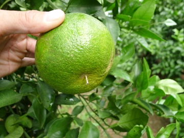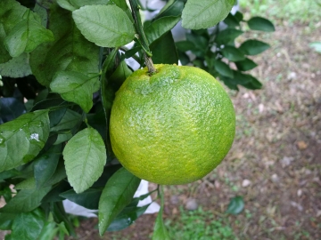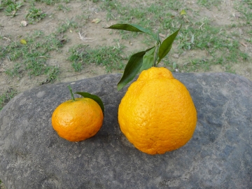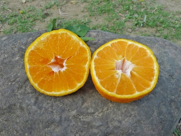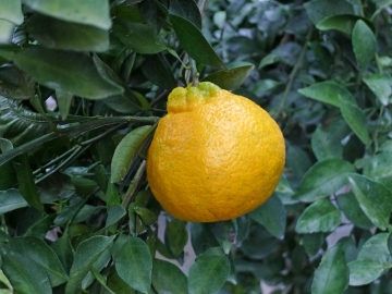 不知火(Shiranui)為日本以清見柑(Kiyomi)與椪柑(Ponkan)雜交育成,果皮黄橙色,多數果實蒂部泡狀凸起,重260~380克,果皮粗厚易剝,果肉特別細緻,甜度13~15,風味獨特,屬晚熟種,台灣在12月下旬果實轉色,持續掛樹至1月中下旬方始採收,鮮採果實又酸又甜風味濃厚,經2~3週貯藏酸度稍退口感更甜,本種晚收、耐貯與其後熟提味的特點真是巧妙搭配,3月中旬的後貯果風味仍然鮮美,不知火在純種果園果實無籽,混種種植下部分果實仍然無籽,多數果實種子3~6粒。 |
